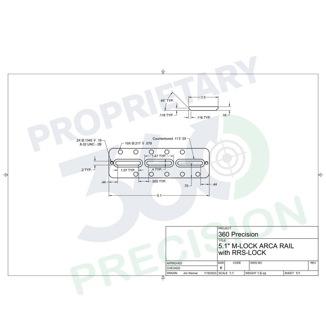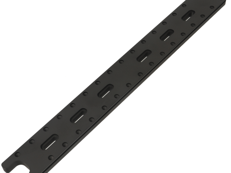 The 360 Precision Lightweight ARCA Rail allows you at connect any ARCA or dovetail attachments including bipods, tripods, plate adaptors, etc. to the bottom of your rifle. The rail connects to the rifle using M-LOK. The rail comes complete with (3) 10-24 screws and (3) M-LOK nuts to mount to your Rifle, Handguard or Forend that features the M-LOK system. The rail weighs 1.6 oz. and is .19” thick and 5.1” long. It is made from 6061-T6511 aluminum and then anodized for protection. These rails also feature Really Right Stuff’s R-Lock system. The R-Lock system is comprised of dimples on the bottom of the rail that works with the RRS ARC-LR – Lever Release Clamp as well as any other ARCA based attachment.