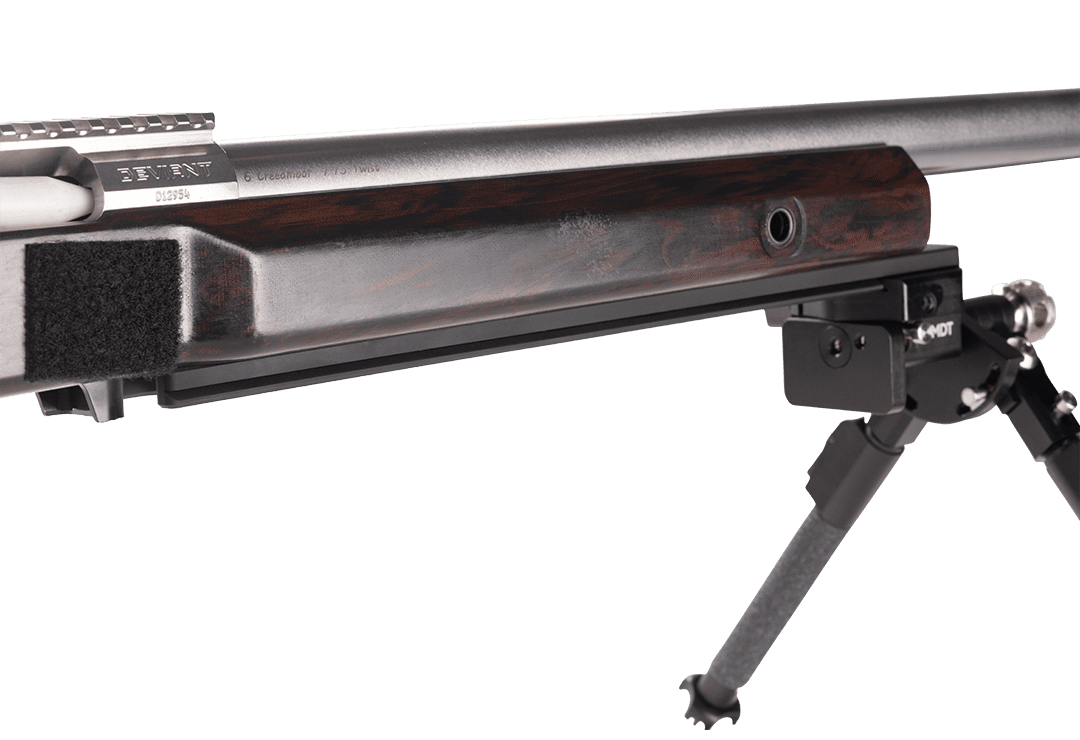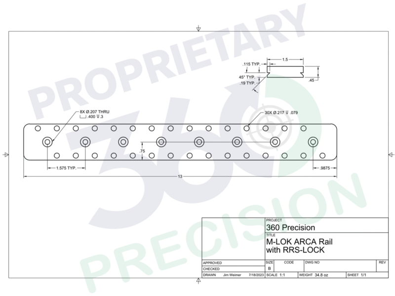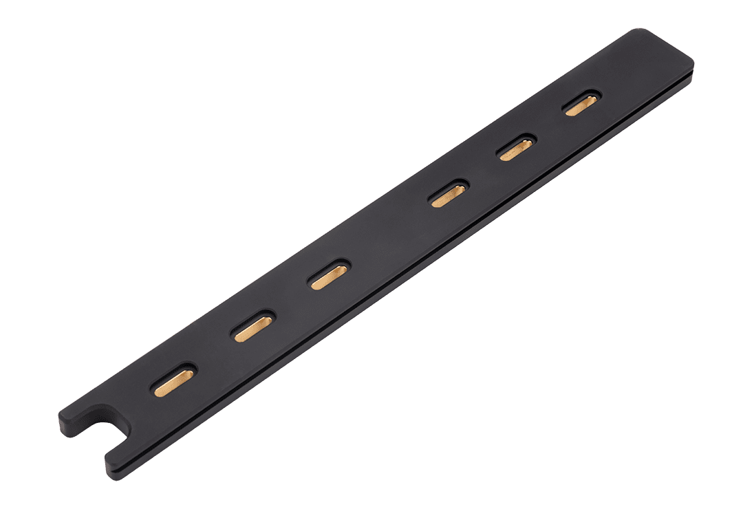 This is a full-length Dovetail mount that works with any RRS attachments including bipods, tripods, plate adaptors, etc. The rail comes complete with the hardware needed to mount to an M-Lok rail or T-nuts installed in the stock can be used. The rails weigh 24.9 oz. with the brass weights installed. The rails are .45β thick and are 13.75β long and are made from 6061-T6511 aluminum and then anodized for protection.
